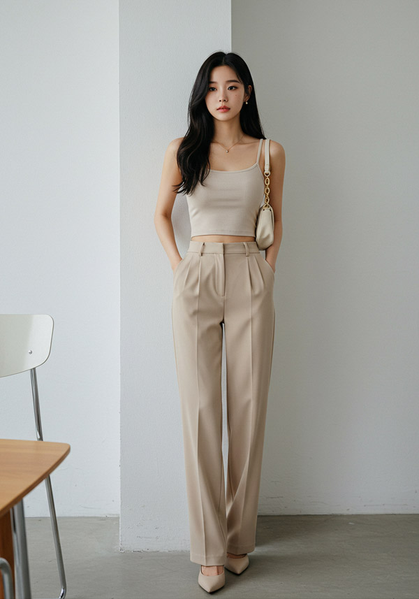 3. 와이드 슬랙스 + 슬림 상의로 대비 연출