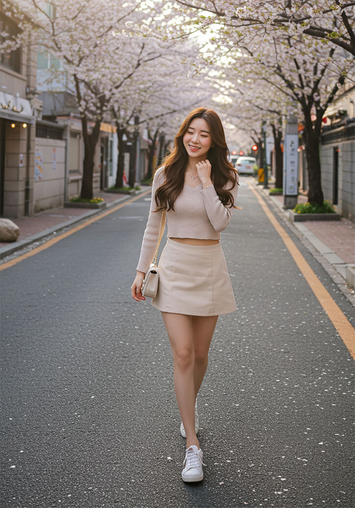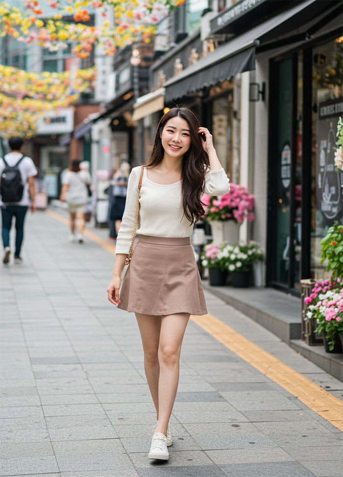 미니스커트는 다리 라인을 노출해 비율을 길어 보이게 하고, 슬림하고 세련된 실루엣을 만듭니다. A라인, 펜슬, 플리츠 등 다양한 디자인으로 체형에 맞춰 선택할 수 있어 여성스러운 곡선을 강조합니다. 높은 웨이스트라인과 결합하면 더욱 다리가 길어 보이는 효과를 낼 수 있습니다.