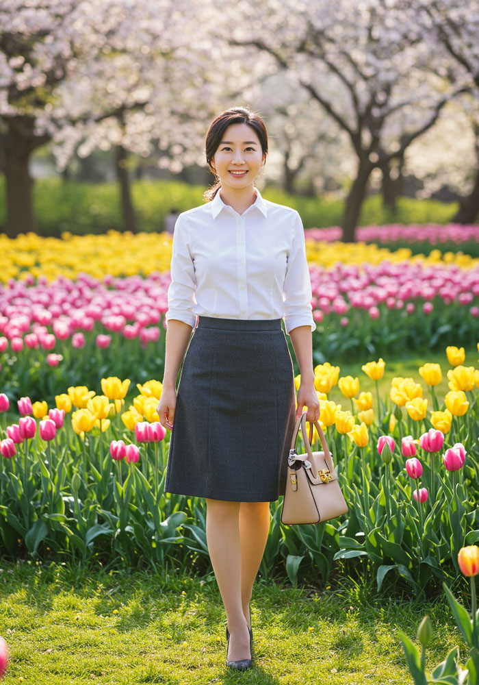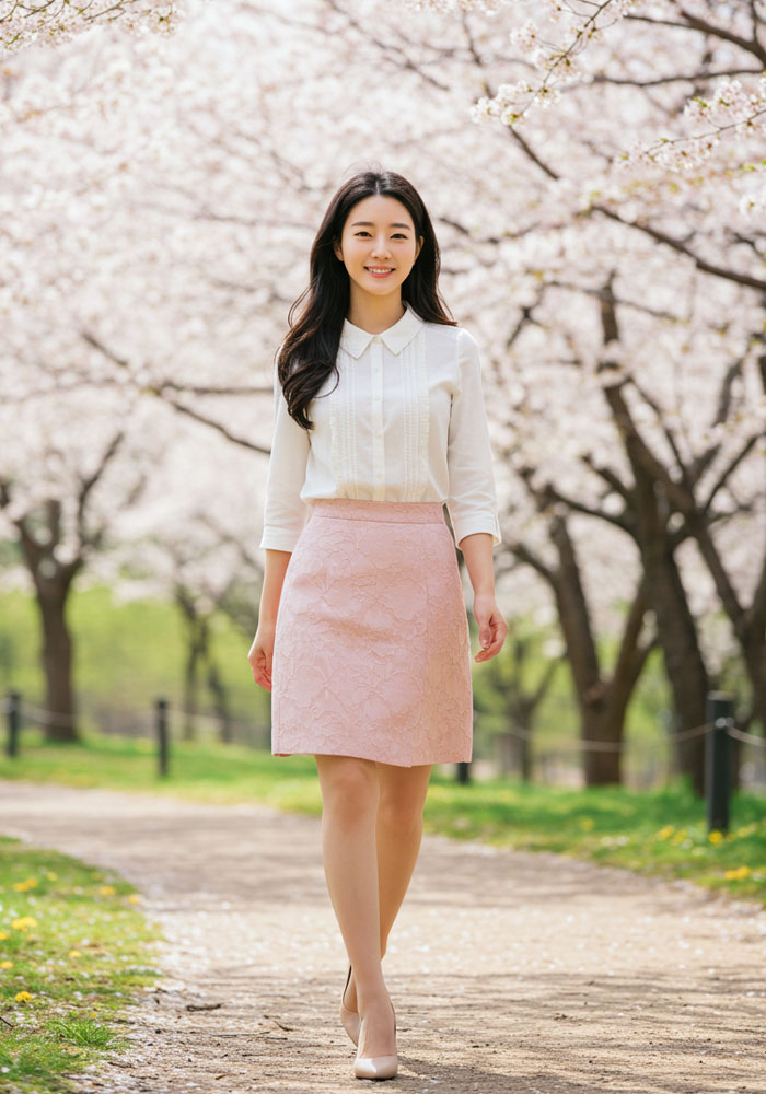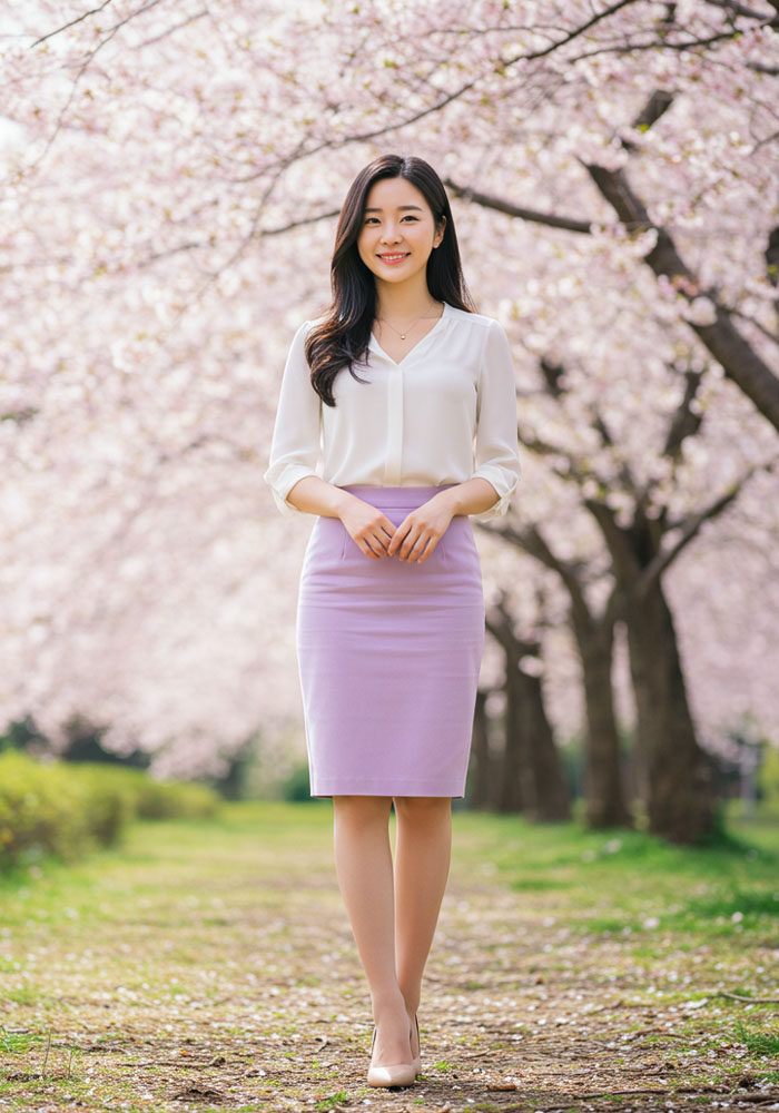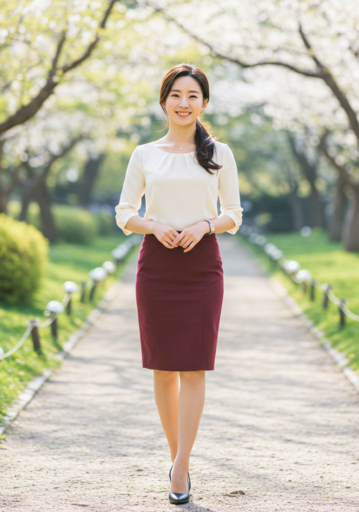 A라인이나 펜슬 스커트는 무릎 아래로 내려오는 길이와 깔끔한 라인이 전문직 여성의 권위를 자연스럽게 강조합니다. (예: 45cm~50cm 밑단 폭의 펜슬 스커트가 다리 라인을 세련되게 연출)