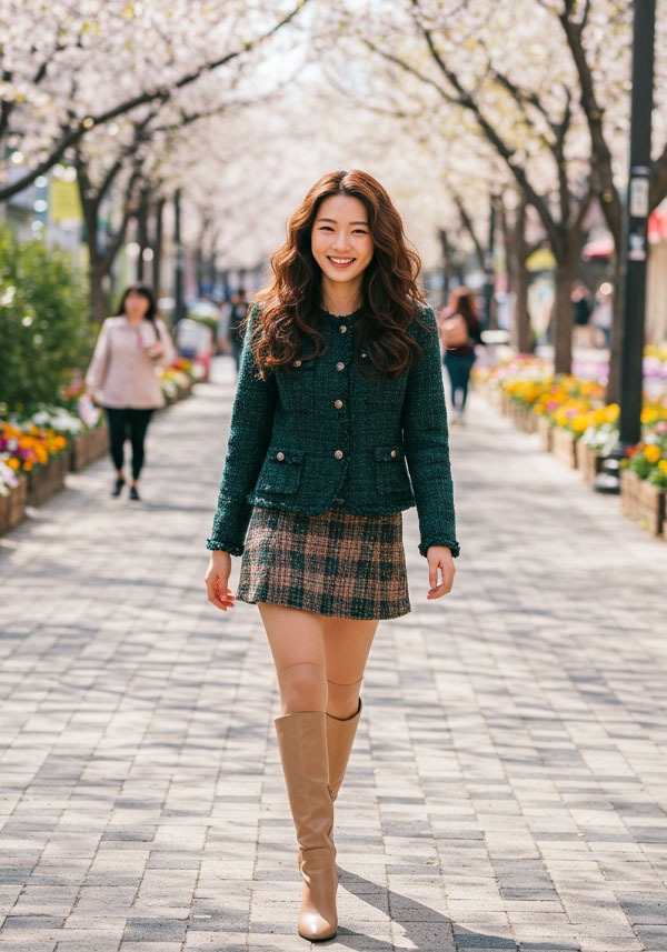 ● 겨울: 울 소재 트위드 자켓과 미니스커트, 롱부츠 & 타이츠로 보온성 유지