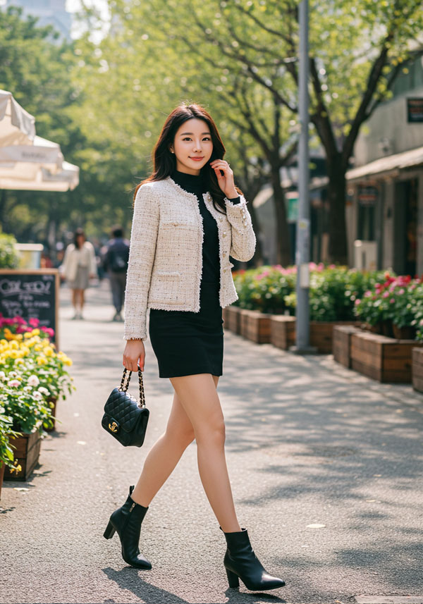 이렇게 스타일링하면 세련되고 트렌디한 트위드 자켓 + 미니스커트 룩을 완성할 수 있어요. 어떤 스타일이든 자신감 있게 연출하면 더욱 멋진 룩이 될 것입니다!